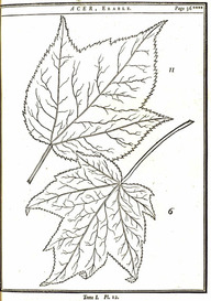 L’érable à sucre (Acer saccharum) n’est pas la seule espèce dont on obtient de la sève sucrée. À l’époque de la Nouvelle-France, on connaît bien aussi la sève de la « plaine ». Cette espèce est l’érable rouge (Acer rubrum) dont la feuille est au bas de l’illustration. D’autres espèces, comme l’érable de Pennsylvanie (Acer pensylvanicum), correspondant à la feuille du haut, ne fournissent pas de sève abondante justifiant une récolte. Source : Duhamel du Monceau, Henri-Louis, Traité des arbres et arbustes qui se cultivent en France en pleine terre, tome I, Paris, 1755, planche 12.